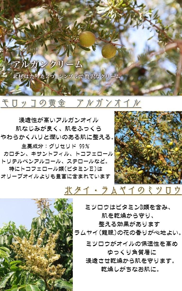 ●モロッコに自生するアルガンの木の実からつくるオイルと、北タイ特産の果物ラムヤイの花を集める蜜蜂の巣からつくったミツロウのみを原料にハンドメイドしたクリームです。