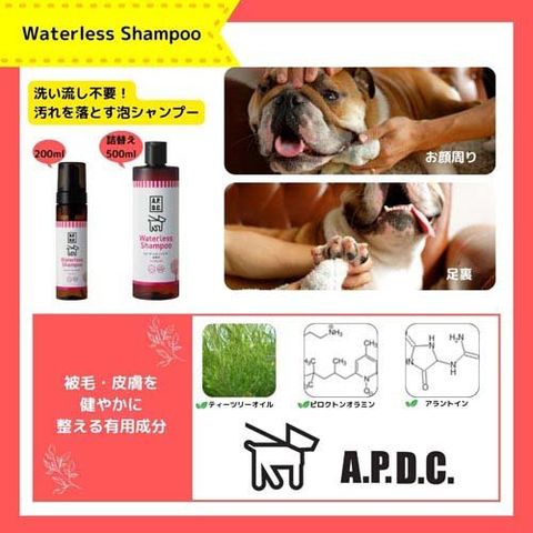 ●お散歩後の足裏の洗浄や介護中の部分洗い、山や海など旅先での汚れ落としなど、色々なシーンで使えます。「A.P.D.C.ウォータレスシャンプー200ml」ボトルに詰め替えてお使いください。