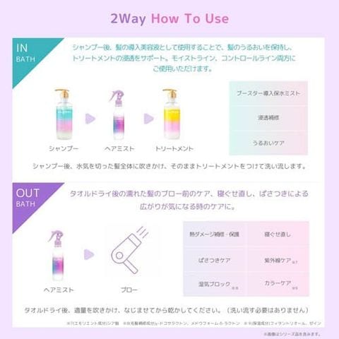 アウトバス使用方法:タオルドライ後、適量を吹きかけ、乾かしてください。寝ぐせ直しにも。