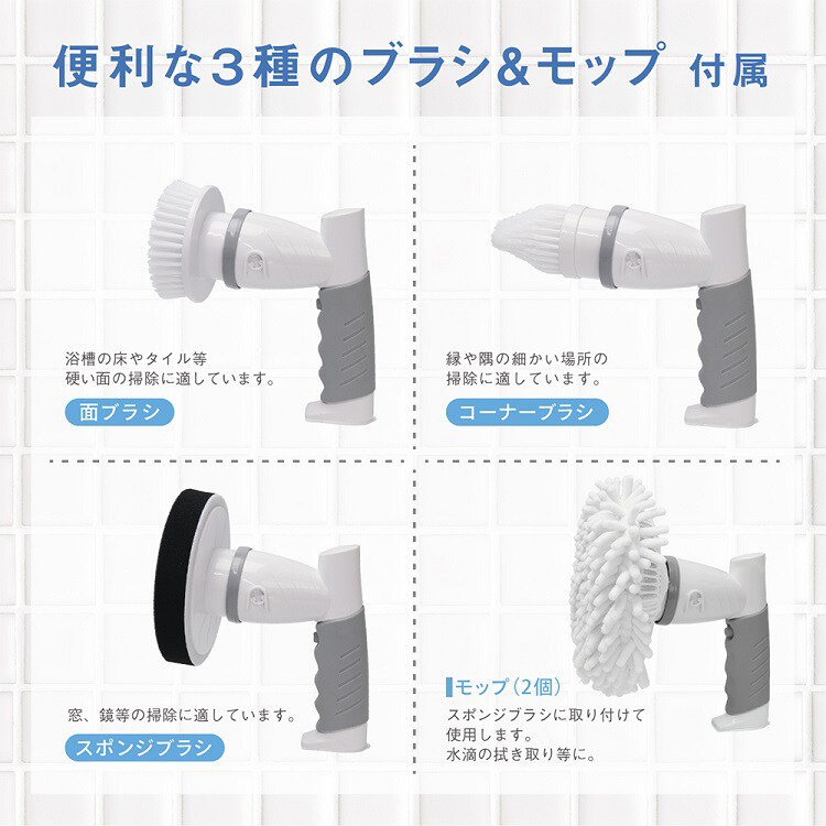 | 本体、面ブラシ、コーナーブラシ、スポンジブラシ、モップ(2個)、アダプタ |