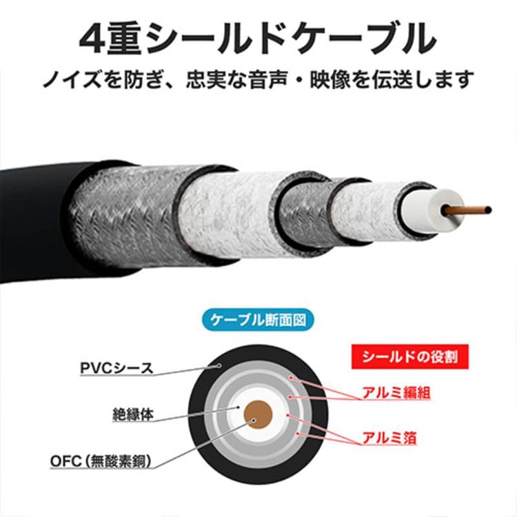 ●アルミ箔とアルミ編組で構成された計4層のシールドが、外来ノイズからケーブルを効果的に保護します。