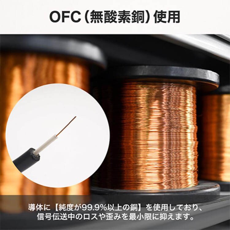 ●導体には伝導性の高いOFC(無酸素銅)を使用しており、伝送中のロスや歪みを最小限に抑えます。