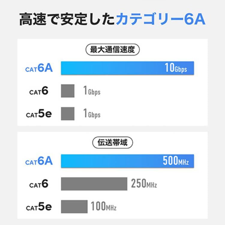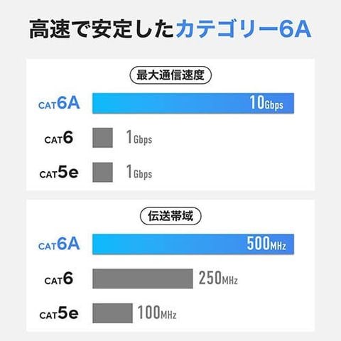 ●10GBASE-T対応のCAT6Aは最大伝送速度10Gbpsを実現。 伝送帯域はCAT6の2倍にあたる500MHzに対応しており、高速かつ快適なインターネット環境をサポートします。