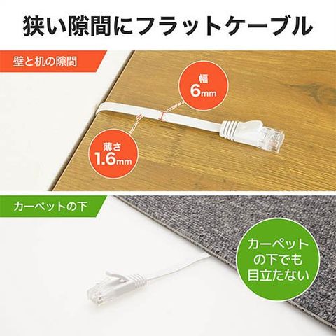 ●薄さ1.6mmのフラットタイプだからドア下の隙間、カーペットの下、壁面などの狭い場所の配線に最適です。