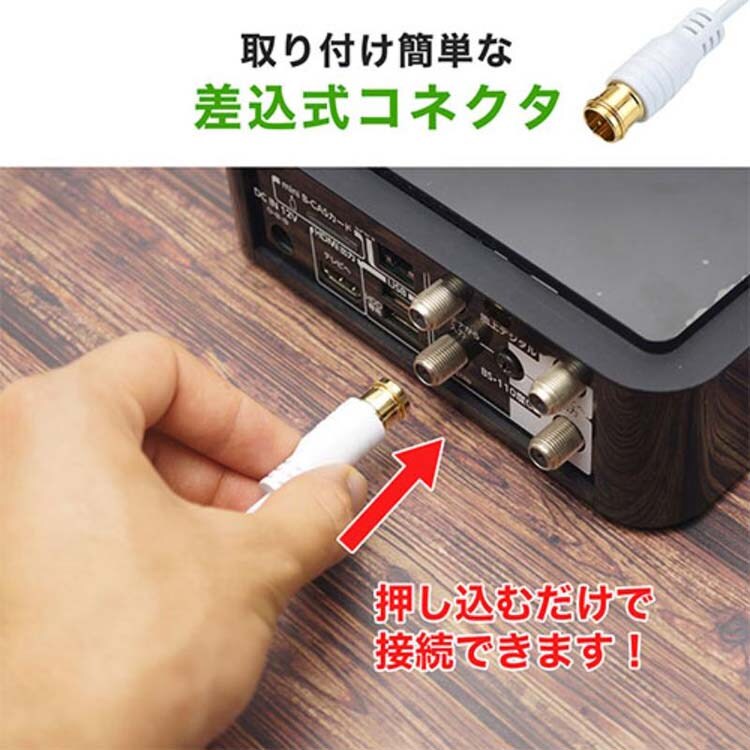 | ・ケーブル規格:S-2.5C-FB ・コネクタ規格:F型 ・コネクタ形状:差込式-差込式 ・コネクタサイズ:W約13.4 x H約13.4 x D約41.2 mm ・インピーダンス:75Ω ・ケーブル直径:約3.5mm ・ケーブル長:50cm ・保証期間:1年間 ・生産国:中国 |