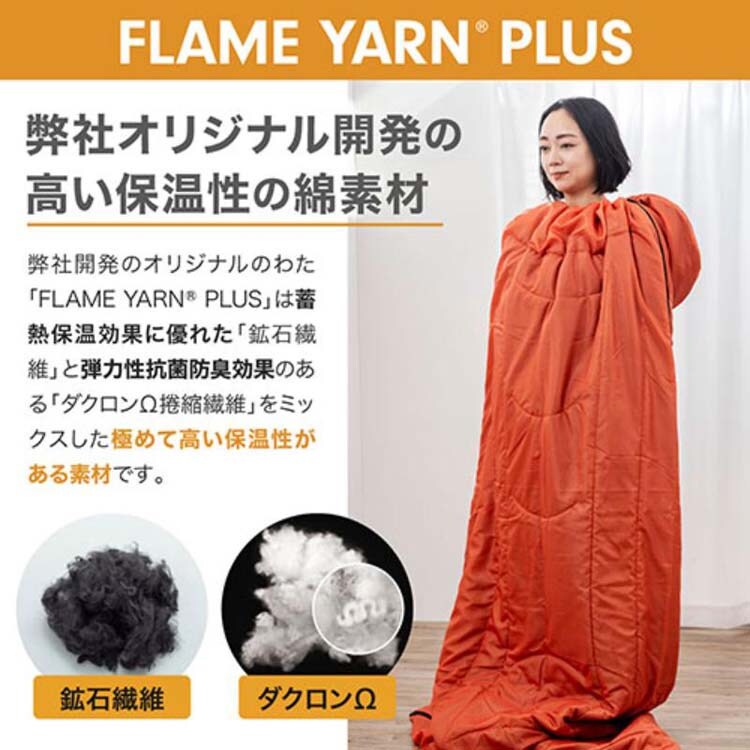 ●FLAMEYARN PLUSは蓄熱保温効果に優れた「鉱石繊維」と弾力性・防臭効果のある「ダクロンΩ捲縮繊維」をミックスしたわたです。