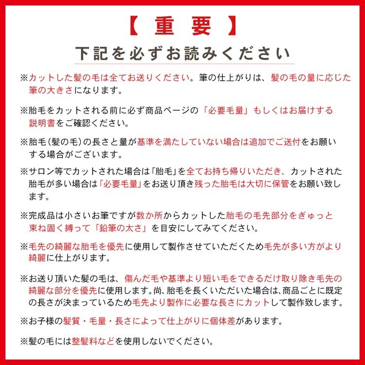 ・胎毛をカットされる前に必ず商品ページの「必要毛量」もしくはお届けする説明書をご確認ください。