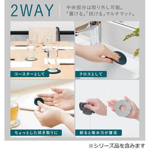 ●洗面台でも便利なマルチWAY。濡れたコップや洗面台も拭けます。コースターの中央部を外し、濡れたコップの側面も拭けます。