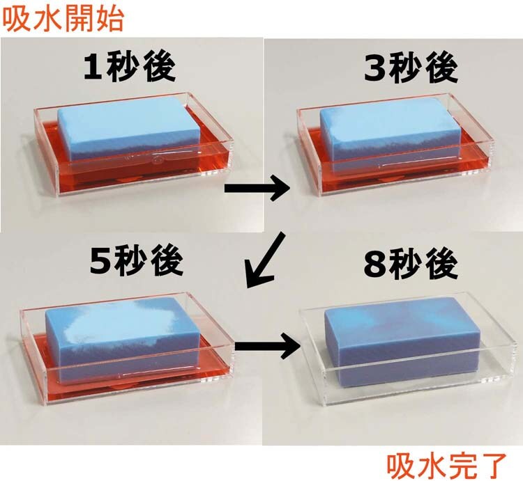※PVAスポンジは、乾燥すると固くなる性質がございます。水に浸けると柔らかくなり、お使い頂けるようになります。固い状態では吸水力が低下しており、またその状態で使用すると対象物に傷を付ける可能性がございますので、柔らかくしてからご使用ください。
