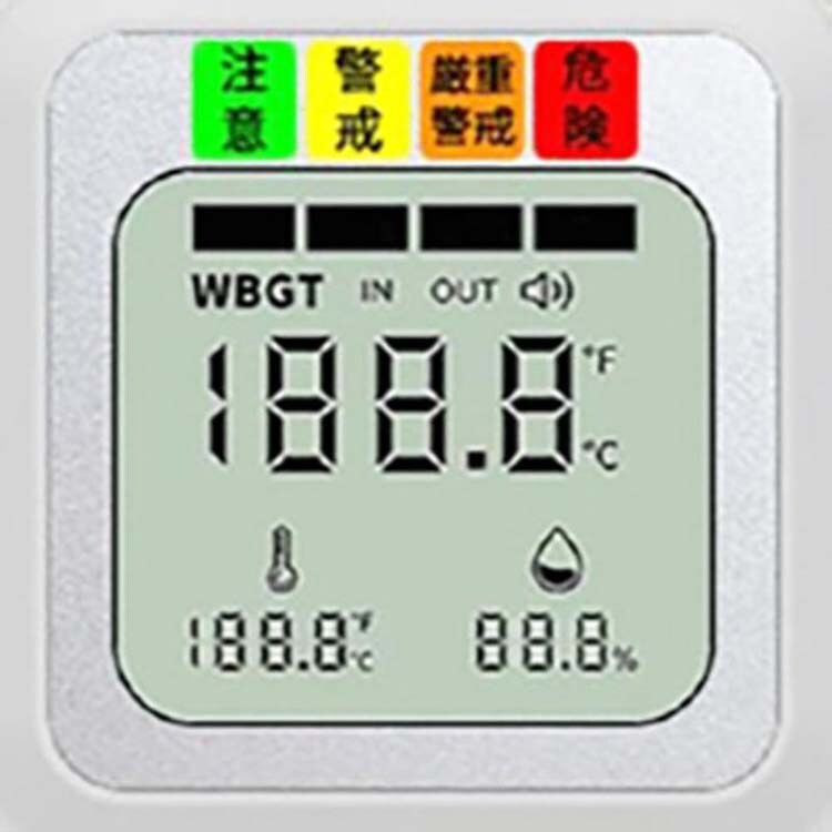●明るい液晶パネル、大画面、大きな数字でWBGT値が見やすい。注意レベルをアラームとランプ(危険レベルのみ)でもお知らせします。