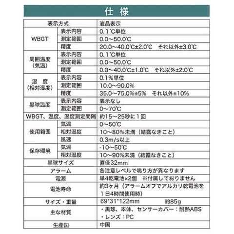 ・WBGT:表示内容 0.1度単位/測定範囲 0.0~50.0度/精度 20.0~40.0度±2.0度 それ以外±3.0度