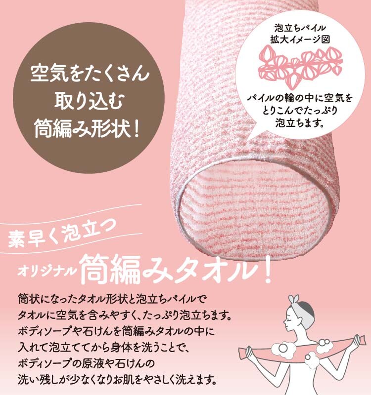 ●筒編み形状で空気を取り込みやすく、素早くたっぷり泡立つ!