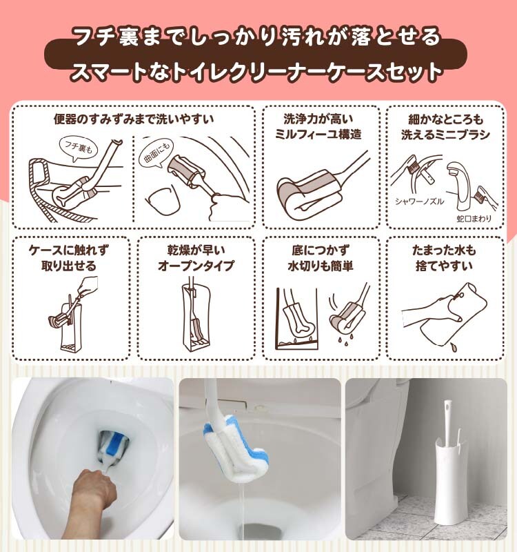 ●便器のフチ裏が洗いやすいトイレクリーナーと乾きが早いオープンタイプの収納ケース、便利なミニブラシがセットになっています。