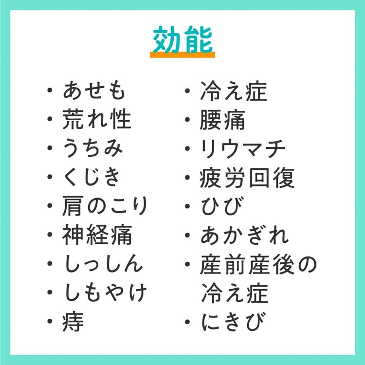 | あせも、荒れ性、うちみ、くじき、肩のこり、神経痛、しっしん、しもやけ、痔、冷え症、腰痛、リウマチ、疲労回復、ひび、あかぎれ、産前産後の冷え症、にきび |