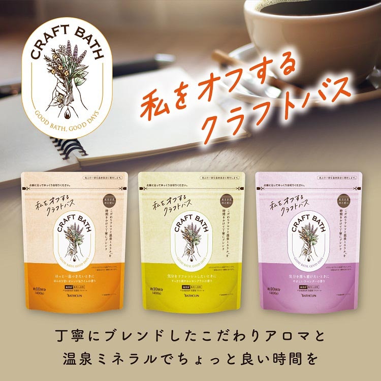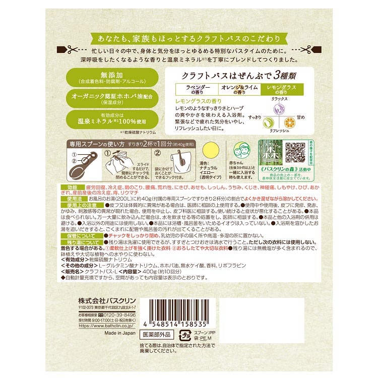 | オレンジ&ライムの香り:400g(約10回分) レモングラスの香り:400g(約10回分) ラベンダーの香り:400g(約10回分) |
