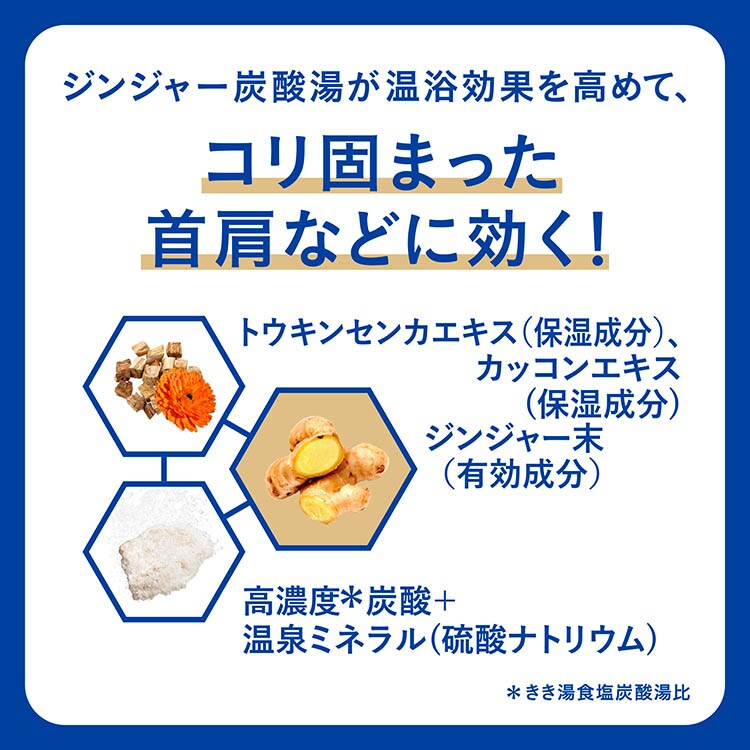 ●高濃度炭酸※2 +生薬(ジンジャー)+温泉ミネラル(硫酸ナトリウム)+トウキンセンカ・カッコンエキス(保湿成分)配合