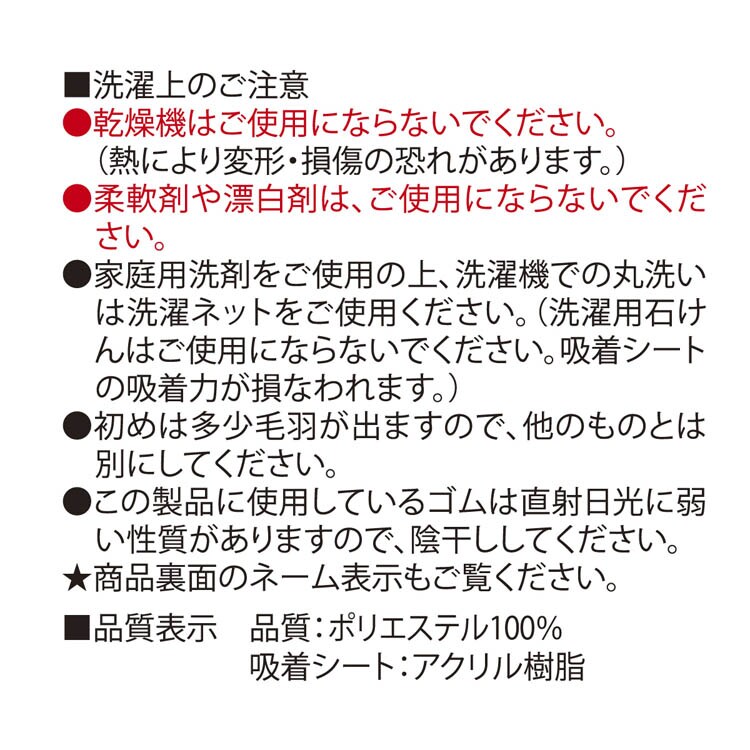 ・家庭用洗剤をご使用の上、洗濯機での丸洗いは洗濯ネットをご使用ください。(洗濯用石けんはご使用にならないでください。吸着シートの吸着力が損なわれます。)
