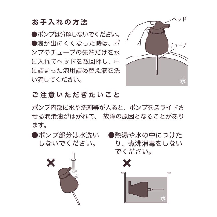 ●太めのポンプで液詰まりに強く、片手でも押しやすい安定感のあるディスペンサーです。