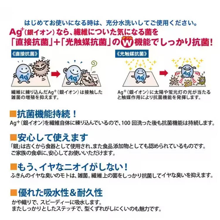 ●Ag+(銀イオン)は「光触媒除菌繊維 銀世界」を採用した食卓用ふきん。 Ag+(銀イオン)で繊維上の菌(細菌・真菌)の増殖を抑制します。