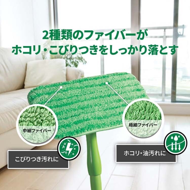 ●2種類のファイバーでホコリもこびりつきもとれる伸縮式ハンドルのモップです。【カラ拭き・水拭き両用】