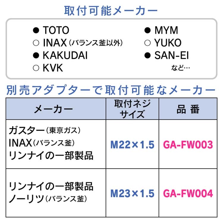 | ・色:ホワイト ・使用温度:1~60度C ・使用圧力:0.05~0.75MPa ・使用流体:上水道水 ・アダプター無しで取付可(取付ネジサイズG1/2):KAKUDAI・TOTO・INAX(バランス釜以外)・SAN-EI・YuKo ・付属のアダプターで取り付け可能:MYM(W23山14)・KVK(M22×2) ・別売のアダプタGA-FW003で取付可能(取付ネジサイズM22×1.5):東京ガス・INAX(バランス釜)・リンナイ(一部) ・別売のアダプタGA-FW004で取付可能(取付ネジサイズM23×1.5):ノーリツ・リンナイ(一部を除く) ・材質:ABS樹脂・ステンレス |