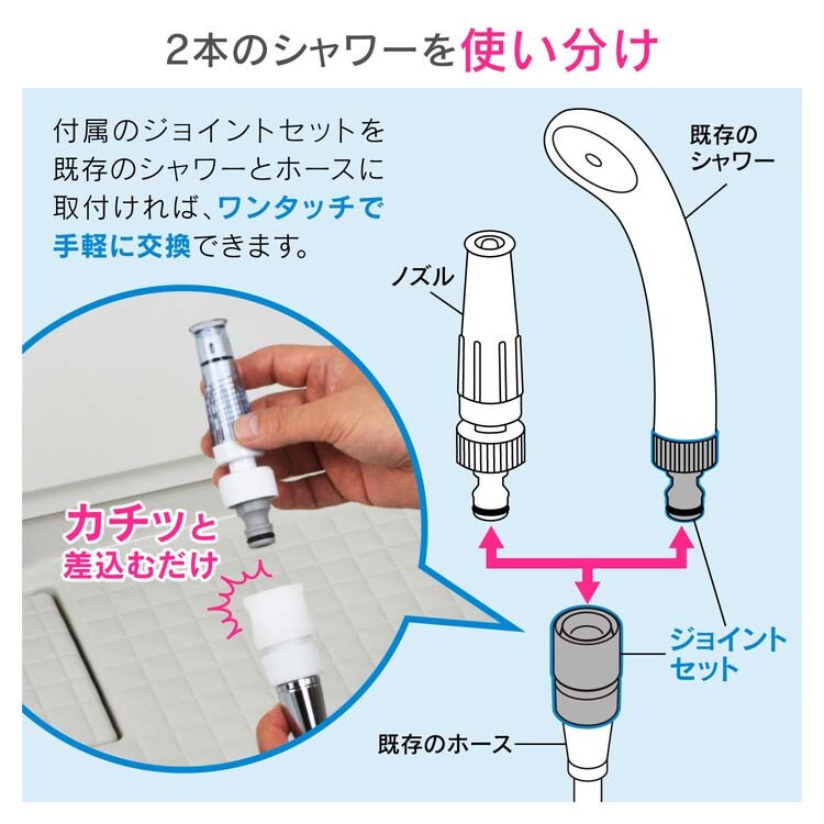 ●ワンタッチでシャワーを交換できるので、用途に合わせて普段使いのシャワーと使いわけできます。