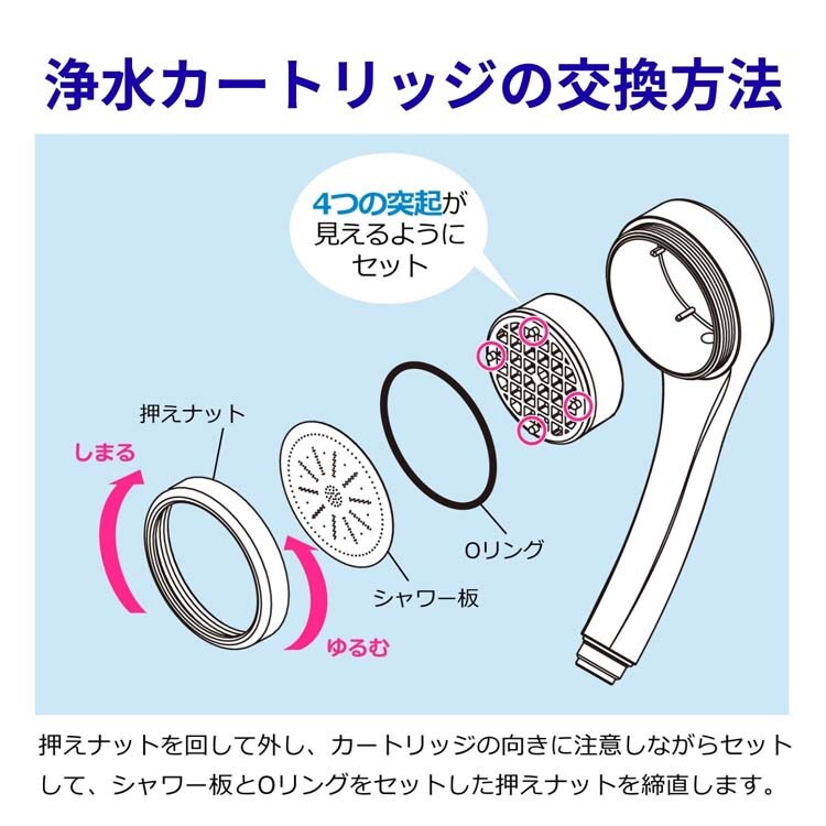 ●カートリッジの交換目安は、1人の場合4ヶ月、2人家族の場合2ヶ月、4人家族の場合1か月です(1日1人8分使用した場合)。