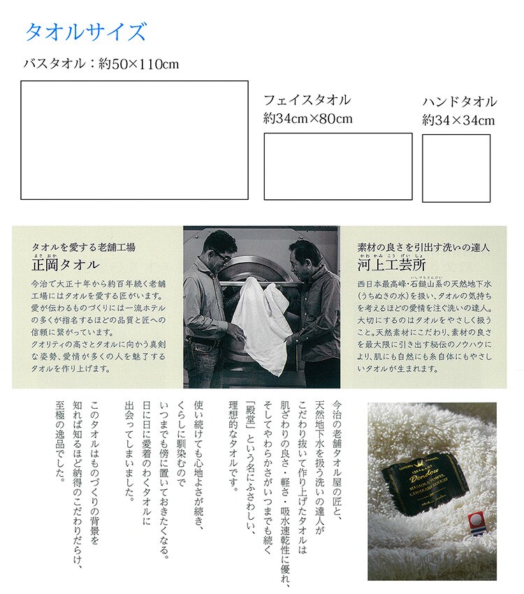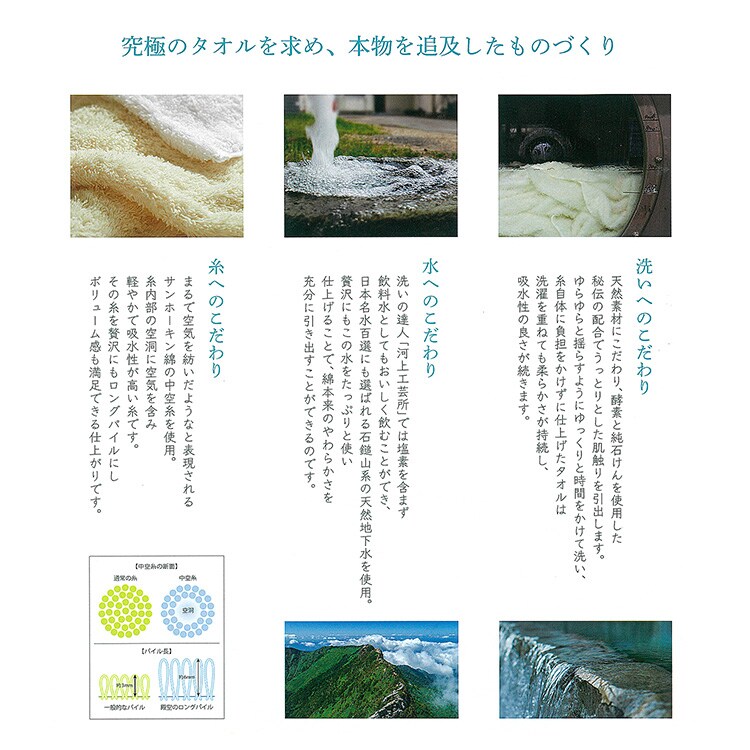 ●今治の老舗タオル屋の匠と天然地下水を扱う洗いの達人がこだわり抜いて作りあげた逸品です。
