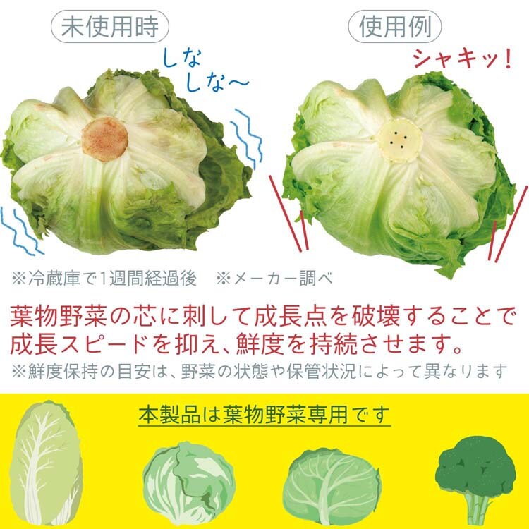 ●葉物野菜の芯に刃を刺して、成長点を破壊することで成長スピードを抑え、鮮度を持続させます。
