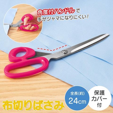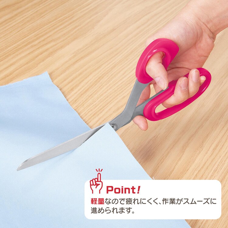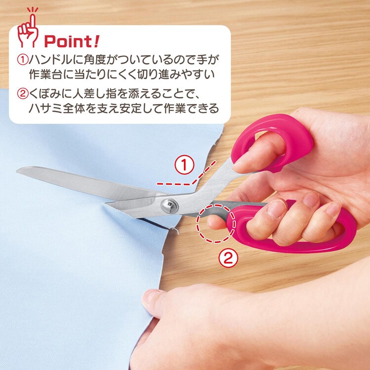 ●手が邪魔になりにくく、切り進みやすい角度付ハンドルの布切りばさみです。