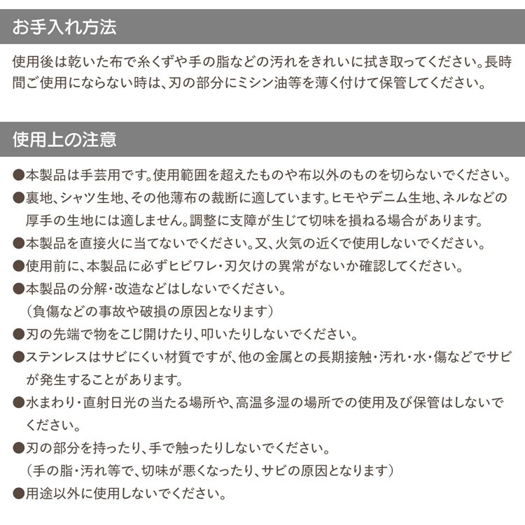 ・本製品は手芸用です。使用範囲を超えたものや布以外のものを切らないでください。