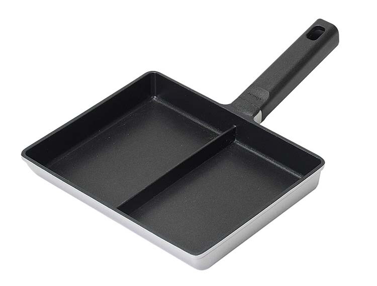 | サイズ:約全長290×幅200×65mm、鍋の深さ/約26mm、中央仕切り高さ/約14mm、1箇所の内寸/約95×155mm 重量:約556g 材質:表面加工/内面:ふっ素樹脂塗膜加工、外面:焼付け塗装 材料の種類:本体:アルミニウム合金、はり底:ステンレス鋼(クロム16%)、取っ手:フェノール樹脂(耐熱温度150度) |