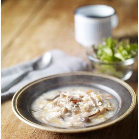 ●きのこがたっぷり入った玄米ともち麦のぷちぷち食感、お出汁が効いたやさしいスープごはんに仕上げました。