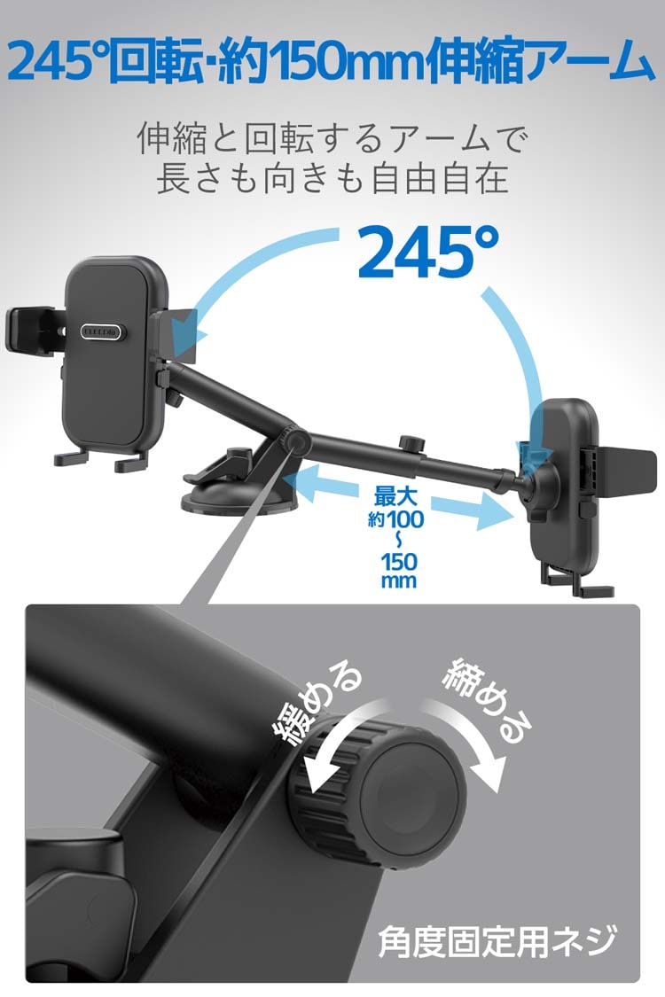 ●約50mm延長できる伸縮アームと、アーム全体が約245度回転する機構で、長さも向きも自由自在に調整可能です。