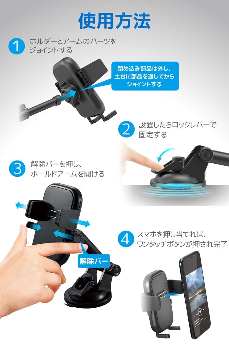 ●ワンタッチボタンにスマートフォンを押し当てることで取り付けができ、解除バーを押し込むことでスマートフォンを取り外すことができます。