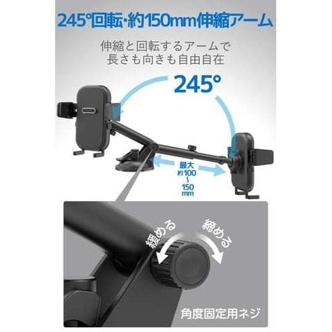 | ・最大外形寸法:幅106*奥行162*高さ110mm(展開方法による) ・重量:約165g ・付属品:ゴム足*2 設置補助板*1 ・対応機種:幅:約54mm~87mm 厚み:約20mm以下 重量:約250g以下 ・材質:耐熱ABS/シリコン/鉄/PU/TPU ・カラー:ブラック ・その他:ゲル吸盤取付 角度伸縮自在ステー |