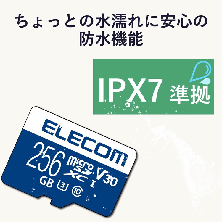 ●「JIS防水保護等級7(IPX7)」に準拠し、メモリカードの交換時などにうっかり水に濡れてしまっても安心の防水仕様です。※変換アダプタは防水ではありません。