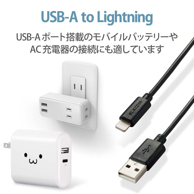 使用目的・用途:USB‐A端子を搭載したPC及び充電器とLightningコネクタを搭載したiPhone、iPad、iPodを接続し、充電・データ転送が可能です。※iPadはPCからは充電出来ません。