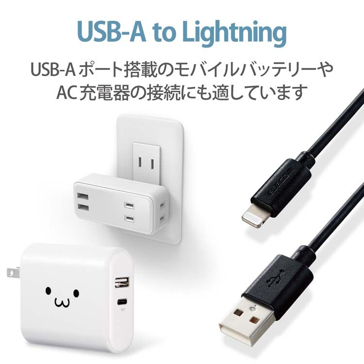 ●iPhoneやiPod、iPadなどのLightningコネクタ搭載機器とUSB-A端子を搭載しているパソコンを接続し、充電・データ通信が可能なLightningケーブルです。