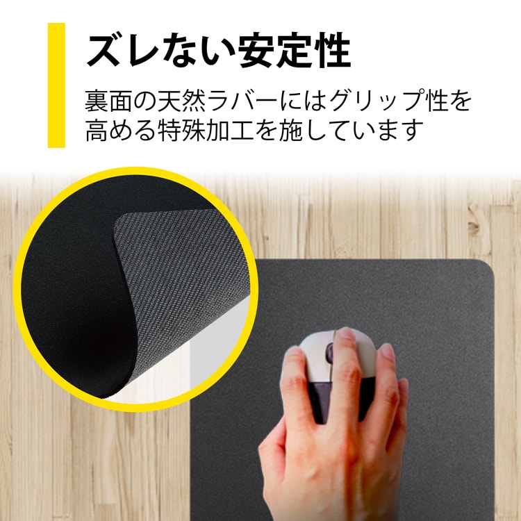 ●裏面の天然ラバーにはグリップ性を高める特殊加工を施し、デスク上でズレない安定性を実現しています。