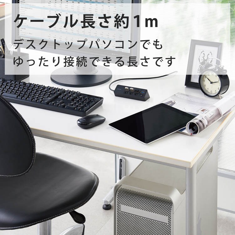 ●ケーブルは紛失の心配がない直付けタイプで、デスクトップパソコンでもゆったり接続できる約1mの長さです。