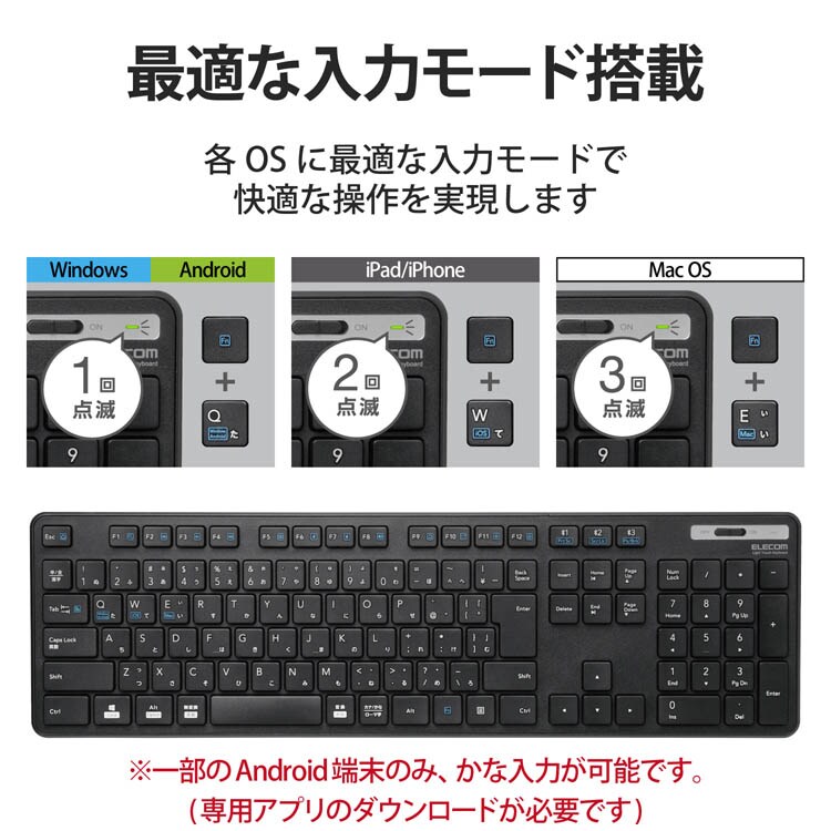 ●Android端末で、キーボードの印字通りのキー入力ができるエレコム独自のアプリ「ELECOM Keyboard layout」に対応しています。 ※AndroidOSは、ご使用端末の仕様によりかな入力ができない場合があります。