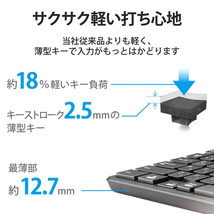 ●サクサクと軽い打ち心地を実現したキー設計を採用した薄型キーボードです。