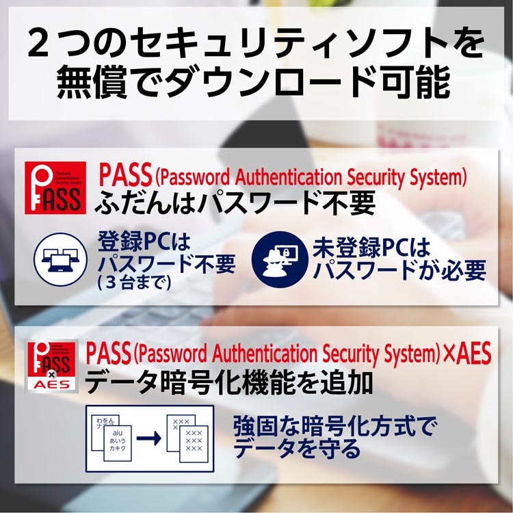 ●「PASS(Password Authentication Security System)×AES」使用時は、保存されたデータは、信頼性の高い強固な暗号化方式「AES256bit」で暗号化されるので、万一の紛失や盗難でも大切なデータの情報流出を防止します。