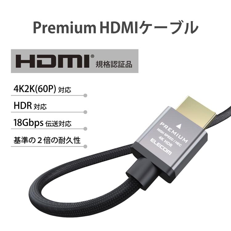 ●18Gbpsの高速伝送で高画質映像と音声を忠実に伝送できるPremium HDMI(R) Cable規格認証済みイーサネット対応Premium HDMIケーブルのアルミコネクタ&ナイロンメッシュタイプです。