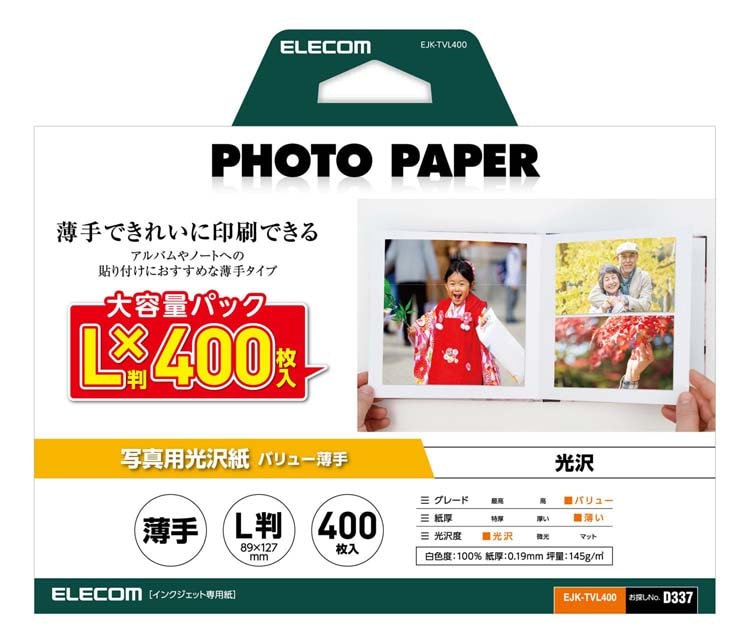 エレコム プリンター用紙 写真用紙 L判 光沢 薄手 ホワイト (400枚入)