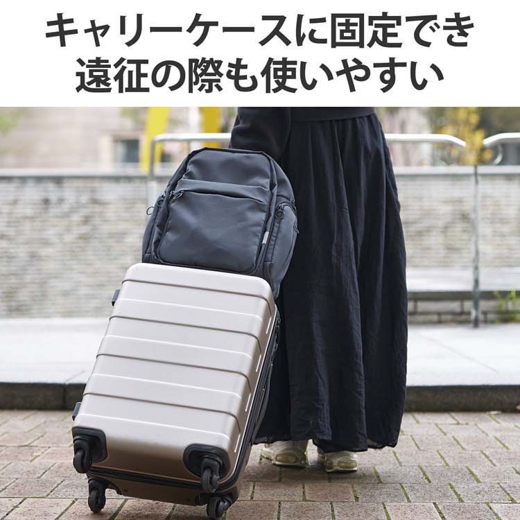 ●背面のキャリーベルトによって、キャリーケースにバッグを固定して使用可能。遠征の際も使いやすい設計です。