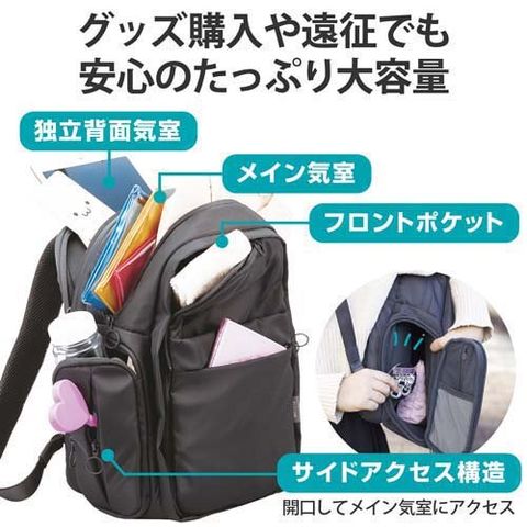 ●サイドポケットのファスナーを大きく開くことで、バッグを背負ったままメイン気室の荷物を出し入れできます。グッズ交換などの際もスムーズです。
