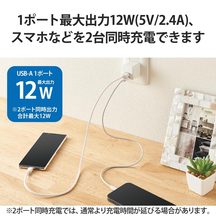 エレコム USB充電器 合計12W 2ポート 折畳み式 ホワイト EC-AC3912WH (1個)