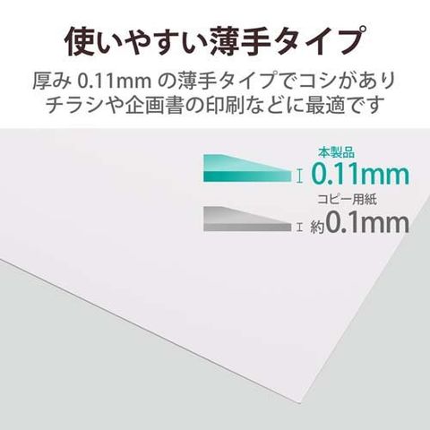 ●厚み0.11mmの薄手タイプでしっかりしたコシがあり、チラシや企画書の印刷などに適しています。